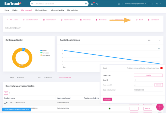 Na het invoeren van het artikelnummer en de besteleenheid, sla je de instellingen op. - Synchroniseer je voorraad artikelen met Exact voor Bouw door per voorraad locatie te klikken op “Exact” rechtsboven op de pagina.