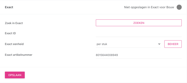Voordat je begint met het toevoegen van artikelen in de voorraad is het belangrijk dat je eerst een koppeling met Exact voor Bouw activeert, dit proces wordt uitgelegd in een dit supportartikel.